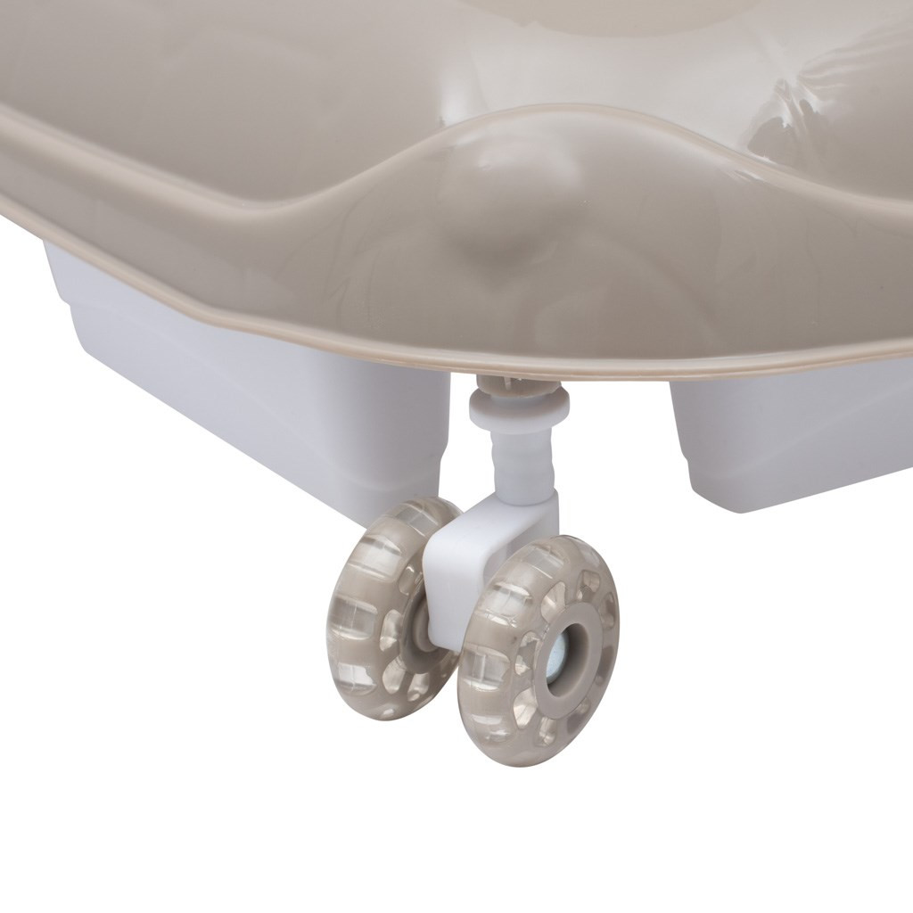 • Biztonságos kialakítás: A bébikomp 4 kerekes rendszere stabilitást nyújt. Az első két kerék 360°-ban forgatható szilikon bevonattal, hogy ne sértsék meg a padlót, míg a hátsó kerekek fixek, automata fékkel ellátva a hátrafelé gurulás ellen.