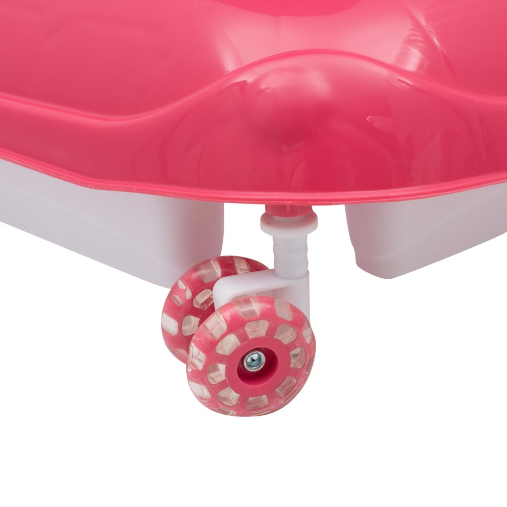 • Biztonságos kialakítás: A bébikomp 4 kerekes rendszere stabilitást nyújt. Az első két kerék 360°-ban forgatható szilikon bevonattal, hogy ne sértsék meg a padlót, míg a hátsó kerekek fixek, automata fékkel ellátva a hátrafelé gurulás ellen.