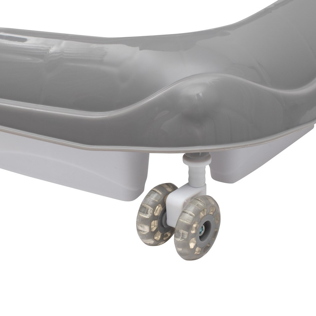• Biztonságos kialakítás: A bébikomp 4 kerekes rendszere stabilitást nyújt. Az első két kerék 360°-ban forgatható szilikon bevonattal, hogy ne sértsék meg a padlót, míg a hátsó kerekek fixek, automata fékkel ellátva a hátrafelé gurulás ellen.