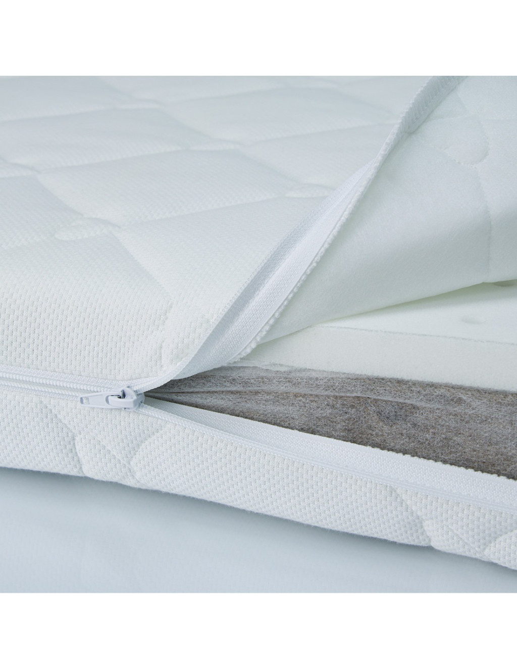 Pamut–poliészter keverékből készült, steppelt huzat háromoldali cipzárral, amely könnyen levehető és visszahúzható.