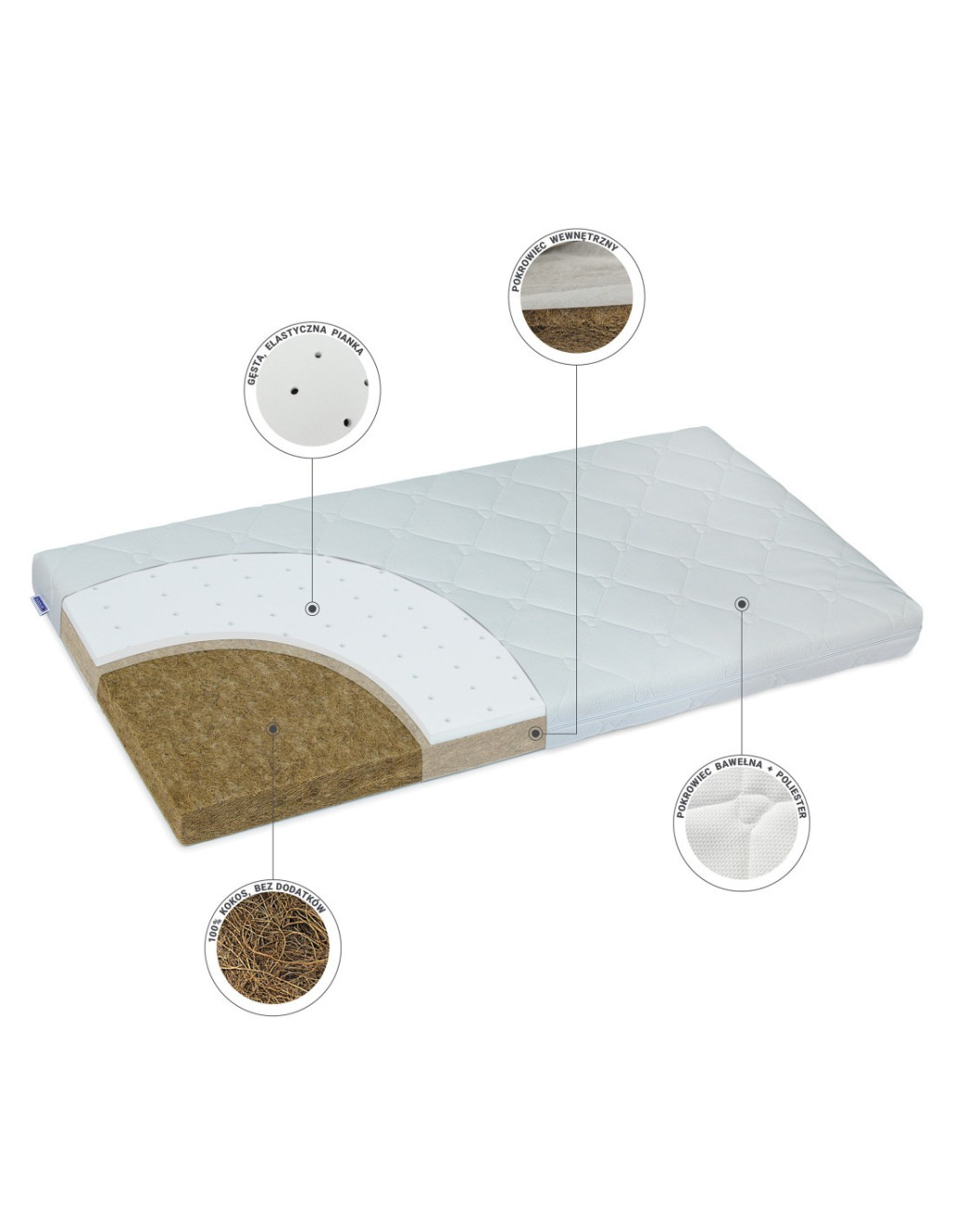 A matrac alapját egy vastag, természetes kókuszrostból készült réteg alkotja – latex és ragasztó hozzáadása nélkül. A kókuszrost egyik legfontosabb tulajdonsága a megfelelő légáramlás és a nedvesség elvezetése.